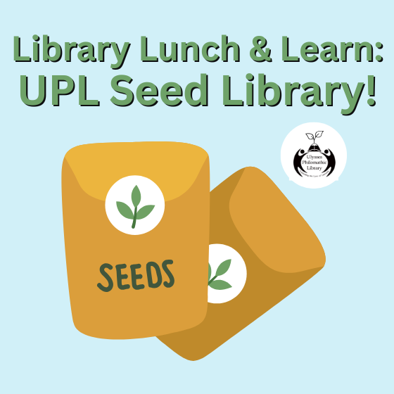 Library Lunch & Learn Tuesday, April 7, 2026 1:00 PM 2:00 PM Google Calendar ICS Using the UPL Seed Library!Bring your lunch and learn at the library! Library Director Laura Mielenhausen and Master Gardener Kimberly Manning will share about the history of the UPL Seed Library and how to get started with seeds in your own space. For adults.