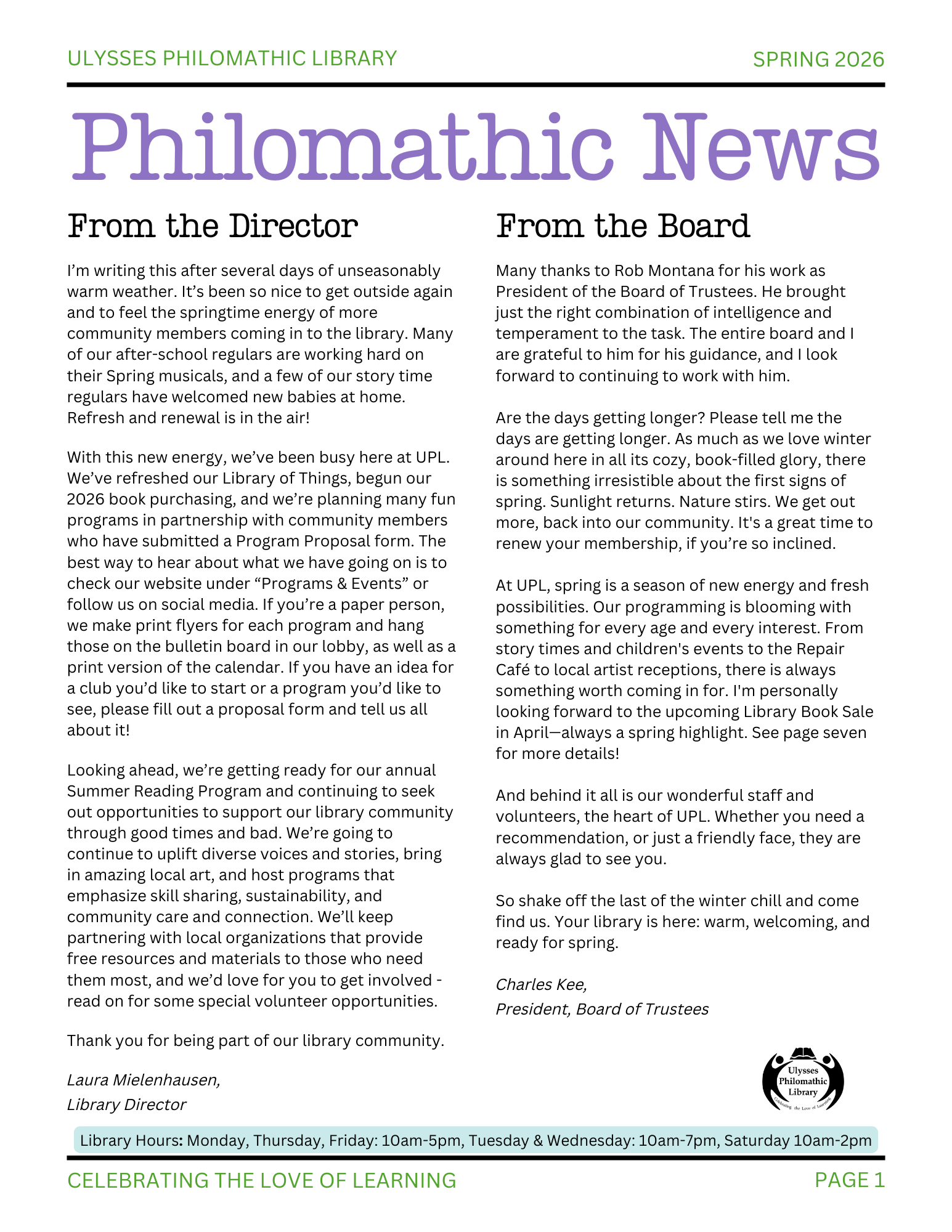 Our newsletter informs patrons about programs, events, and general updates at the library. It is published in the spring, summer and fall in paper copies and here digitally.